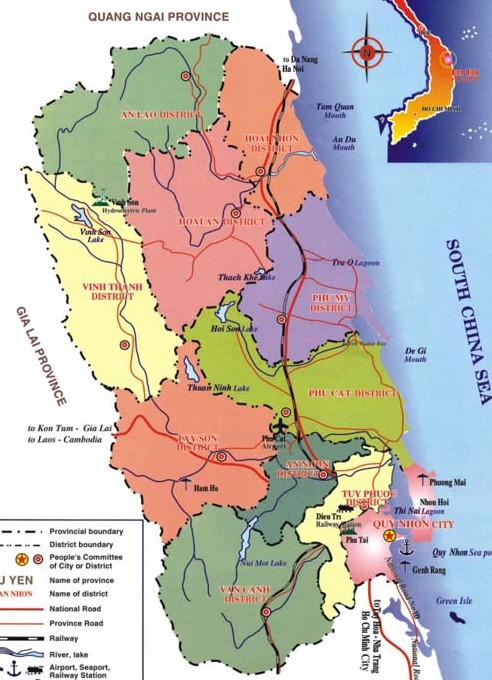 La ciudad de Qui Nhon se encuentra al sureste de la provincia de Binh Dinh. Esta limitada por la costa al este, en el oeste por el distrito de Tuy Phuoc, en el norte por Tuy Phuoc y el distrito de Cat Phu, en el sur por el distrito de Song Cau de la provincia Phu Yen. La ciudad tiene 16 recintos y 4 aldeas con 215 km. cuadrados. La población en 1999 es 240.000 Habitantes.