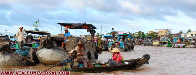 El mercado, desde mi punto de vista ha menguado (en 2004 había incontables barcos y se hacía difícil transitar entre ellos), quizá por la hora (es más tarde que en 2004) o la crisis. De todas formas sigue siendo muy llamativo, barcos de todos los colores y tamaños trasegando, de uno a otro, todo tipo de mercancías (frutas y verduras), luz y color. Barcos-bares, que te preparan un desayuno en un abrir y cerrar de ojos. Deslumbrante, exótico, multicolor y distinto. Como siempre.