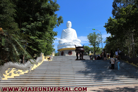 Salimos de “debajo de los toldos azules” que rodean el mercado, realmente creo que hemos visitado “los aledaños” del mercado, por la zona interior hemos pasado de refilón, y cogemos nuestro transporte con aire acondicionado para ir hasta la pagoda Long Son (la que tiene un buda blanco inmenso que se divisa desde todos los puntos de la ciudad, incluidos la explanada de la Catedral y la planta 12 del hotel donde se encuentran nuestras habitaciones).