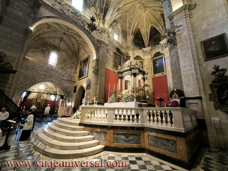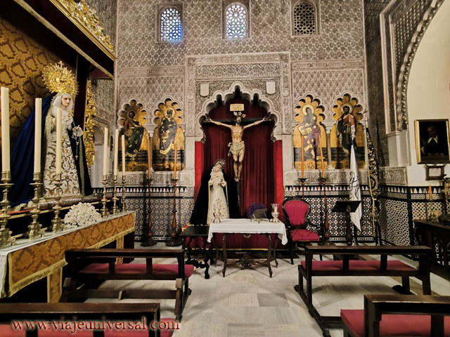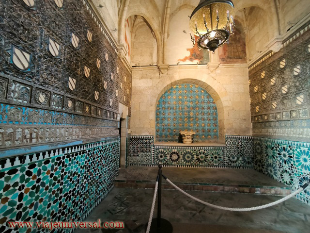 Nada más entrar a la derecha podemos admirar los restos de un antiguo palacio árabe, tras una reja de forja, enmarcada por un magnífico arco de herradura. La riquísima decoración con yeserías y frisos de cerámica de tradición árabe de esta capilla contrasta con el sobrio y elegante estilo gótico cisterciense del resto del templo.