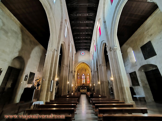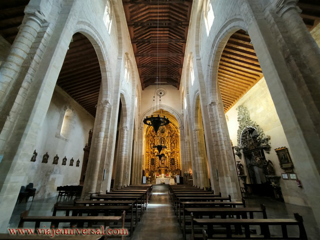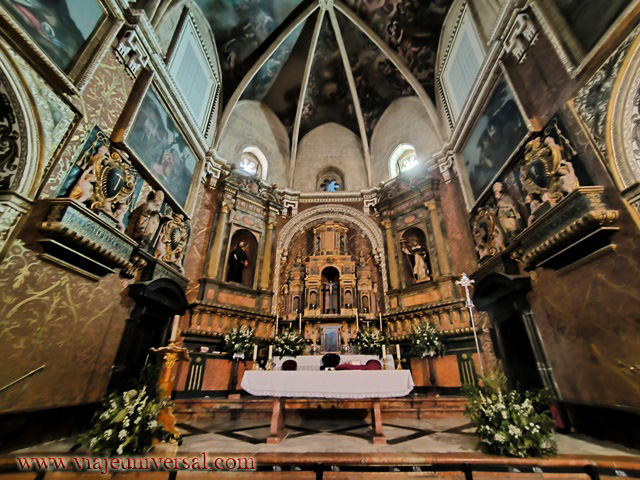 Otra de las particularidades que tiene se puede observar en la nave central más profunda, alta y ancha que las laterales, está cubierta con armadura de madera, con tirantes de forja, compuesta bajo los postulados manieristas. Esta cubierta es de un valor artístico sobresaliente pero si queréis ver la original del siglo XIII podéis contemplarla en la sacristía a escasos metros sobre nuestra cabeza. Es fantástico el diseño y lo bien conservada que está. Otra de las maravillas que descubrí en esta iglesia está en un pequeño cuadro que también está en la sacristía y que es la representación del Cristo crucificado y Dios padre sobre un fondo dorado de sobre un pequeño cuadro en forma de cruz. Una "pequeña" maravilla. Finalmente otro detalle arquitectónico que hay es una escalera de caracol que sirve de acceso a una de las torres traseras. Un gusto ver su tallado en piedra y lo perfecto de su diseño. Todo un descubrir es el pasear por este templo.