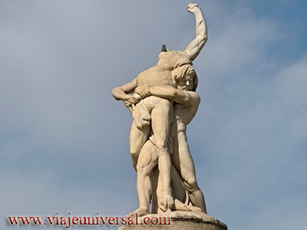Seguimos andando has la Fuente de Hércules y Anteo es una obra monumental que representa una de las escenas más dramáticas de la mitología griega. La fuente muestra a Hércules, el héroe mitológico, luchando contra Anteo, un gigante que poseía una fuerza descomunal, derivada de su contacto con la tierra. Según la mitología, Anteo era invencible mientras estuviera en contacto con su madre, la Tierra. Sin embargo, Hércules logra derrotarlo levantándolo del suelo y aplastando su fuerza, lo que simboliza la victoria de la inteligencia y la estrategia sobre la pura fuerza bruta.