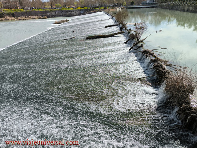 Andamos hasta la parte izquierda donde se encuentra La Presa del Palacio de Aranjuez es un componente importante de los jardines y del sistema hidráulico que abastece de agua al Palacio Real de Aranjuez y a sus jardines circundantes. Esta estructura se encuentra en el río Tajo, y su función es garantizar el suministro de agua para las fuentes, estanques y canales de los jardines, que son uno de los elementos distintivos del conjunto palaciego.