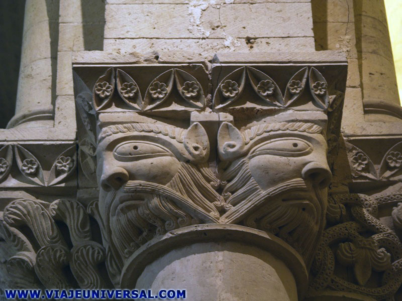 El interior es puramente románico, la planta de tres naves desembocan en los ábsides, los enormes pilares destacan sus magníficos capiteles donde se personifican figuras que nada tiene que ver con escenas bíblicas usuales, se representan una colección de mascaras humanas, criaturas medievales, elefantes y follaje.