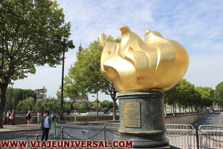 Nos marchamos en el metro, el precio es de 12,20 euros para un taco de diez billetes; la estación La Défense es la primera de la línea número 1, hacemos un trasbordo en Franklin D. Ruosevelt, donde cogemos la línea 9 para llegar a la estación de Alma-Marceau; nada más salir a las calles de París nos chocamos con “Flamme de la Liberte” es una replica exacta de la antorcha que sujeta la estatua de la libertad en Nueva York, ofrecida por el pueblo francés para todos los destinatarios del mundo entero. Es un símbolo de la amistad franco-americana, coincidiendo con el centenario del periódico Internacional Herad Tribune, París 1887-1987.