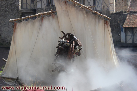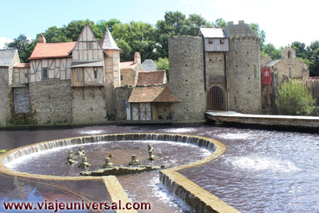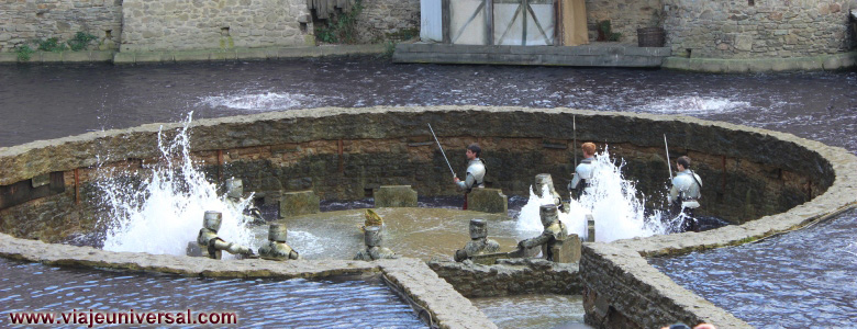 A las 13,00 horas acudimos al nuevo espectáculo estrenado en este año, se trata de “Les Chevaliers de la Tabla Ronde ”. El escenario es la puerta principal de la antigua ciudad medieval de Puy du Fou, donde se recrea la historia de la Leyenda del Rey Arturo, la obra es corta porque solamente dura unos15 minutos