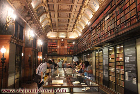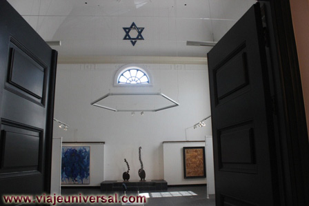 En el interior la planta baja era la dedicada a los servicios religiosos, ahora esta dedicada como sala de exposiciones, en la galería superior, estaba dedicada para que las mujeres siguieran los servicios religioso, ahora es una exposición con fotografías de las principales familias judías, donde se pueden ver: banderolas de seda para cubrir las escrituras judías, esculturas que hacen referencia al sufrimiento de la comunidad, el titulo de compra de los terrenos del cementerio judío, un uniforme de un preso del campo de concentración de Dachau y numerosos objetos para la celebraciones religiosas, también podemos ver un cuadro basado en una fotografía de Anne Frank.