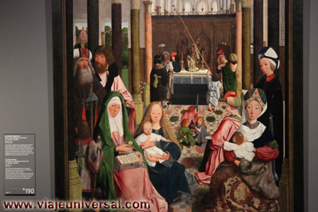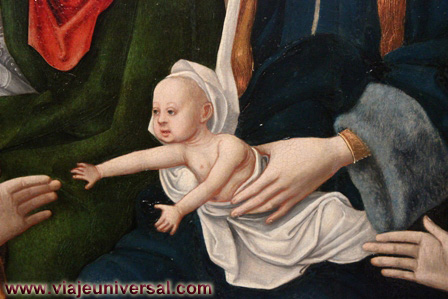 En la parte inferior nos habla de la infancia de María, en uno de ellos se ve a los padres de María: Ana y Joaquín como son abordados por un ángel con unas cabras que les anuncia el nacimiento de su nieto. Otro dibujo nos cuenta la historia de los padres de María, los dos están reunidos ante La Puerta Dorada y ella le dice a su esposo “Dios me ha llenado de bendiciones”; el siguiente cuadro nos habla de la presentación de los padres de María en el templo, ambos llegan con las manos extendidas en señal de ofrendas; en el siguiente se ve a María haciendo una ofrenda en el templo, ella ha crecido en tamaño y santidad y se la representa con un halo sobre la cabeza; a continuación se ve a María como recibe un premio de las manos de un ángel.