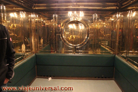 En el interior del túnel se abre una puerta de un ascensor que nos sube hasta la cima del refugio, el indicador de los pisos del ascensor ha desaparecido y en su lugar indica los metros de diez en diez hasta la cima para totalizar los 124 metros que nos separa desde el túnel hasta la parte más alta. El ascensor es de madera muy propio de la belle epoque, esta revestido en algunos lugares de espejos y bronces dorados, en las paredes tiene un friso blando revestido de piel que le hace ser más intrigante, imaginamos como Eva Braun coqueteaba con el dictador antes de subir hasta el refugio.