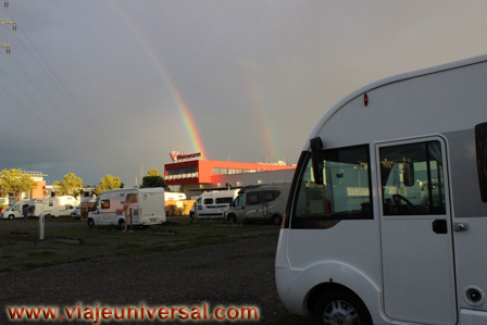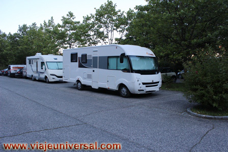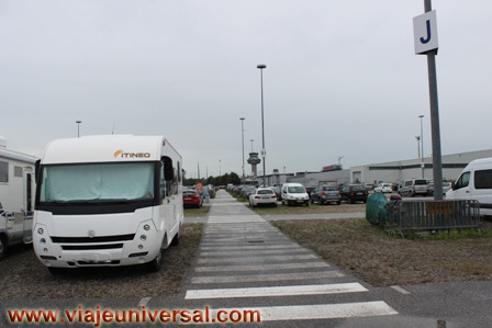 Es un aparcamiento de pago, no tiene ningún servicio, en la zona de coches nos es imposible aparcar por la limitación de los galitos de altura y tenemos que irnos donde los camiones, nos ponemos lo más lejos posible de los camiones para que nos garantice el descanso durante la noche, sobretodo miramos a que a nuestro lado no haya ningún camión frigorífico.