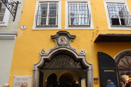 Estamos en la calle Getreidegasse nº 9 donde se encuentra una parte de lo que constituye el Museo Mozart. Se trata de la casa natal del compositor o la Mozarts Geburtshaus. El otro edificio del museo es la residencia del compositor que aquí se llama Mozart-Wohnhaus.