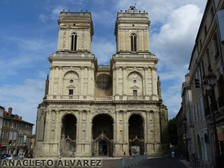 Seguimos viaje hacia Auch. En el camino, nos llamó la atención una gran torre de iglesia y el anuncio de que en el pueblo había una extraordinaria iglesia de los siglos XIII – XV, una estupenda plaza porticada con estatuas fuente... En el pueblo estaban en fiestas, aunque no vimos de la fiesta más que unas carpas y alguna barraca. A modo de anécdota, nos encontramos con una señora en la iglesia que se extrañaba que no se celebrara la misa de todos los días laborables a esa hora; yo le dije que hoy era festivo en Francia y ella me preguntó por qué; cuando le dije que era el 14 de julio, comprendió que no hubiera esa celebración religiosa a las 17 horas aún no se había enterado.