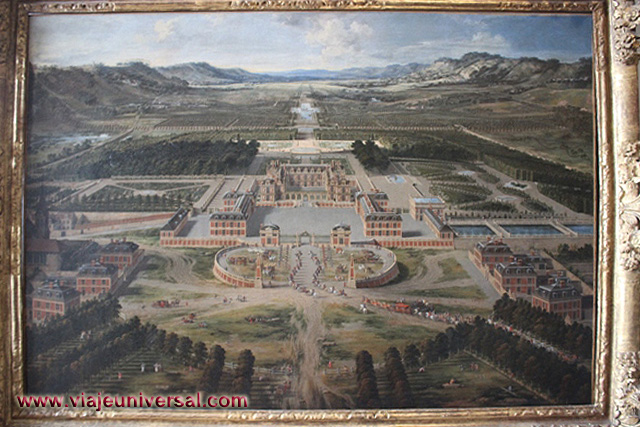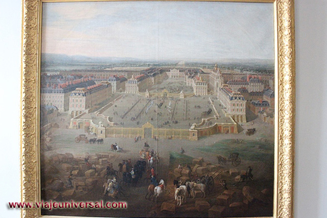 Esta pintura data de 1668, representa una vista imaginada del castillo de Versalles como era en esa fecha, es decir, en gran medida como Luis XIII lo había dejado, aunque con los primeros arreglos de Luis XIV. Sin embargo, el pintor se tomó libertades con la topografía y arquitectura, con el fin de ofrecer una vista de un Versalles idealizado y más exitoso de lo que realmente era en ese momento, para proporcionar una imagen del poder del rey constructor.