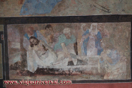 En la fila superior, Cristo está acompañado por seis personajes, tres a cada lado. La fila inferior fue parcialmente destruida por la perforación de una ventana de tercer punto en el siglo XIII. Los caracteres en este registro son de una factura más bárbara que los del registro superior. A la izquierda de este bajorrelieve hay un nicho con dos animales heráldicos erigidos y confrontados.