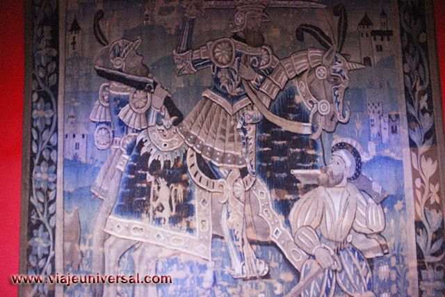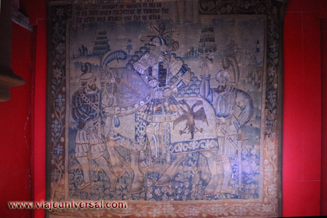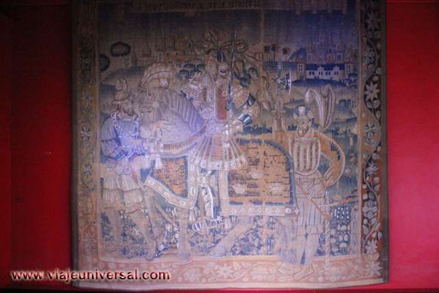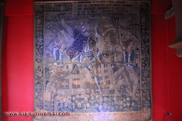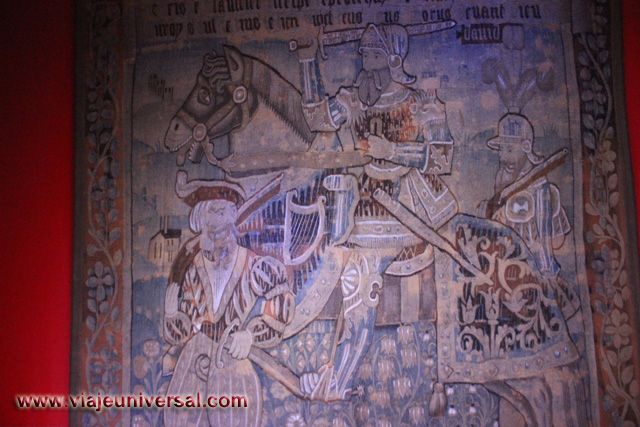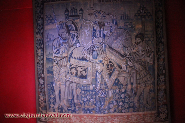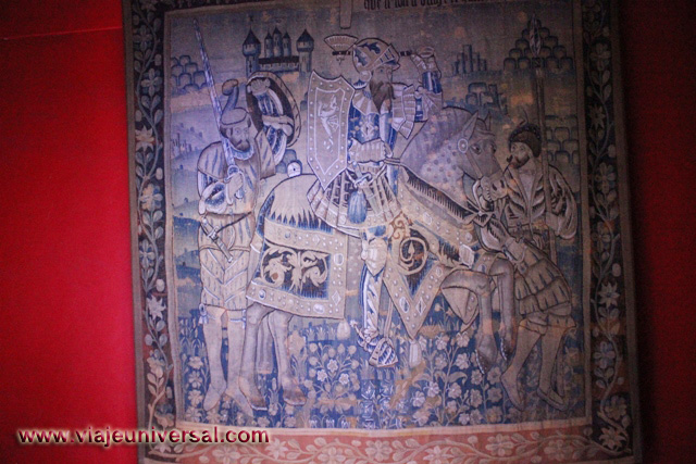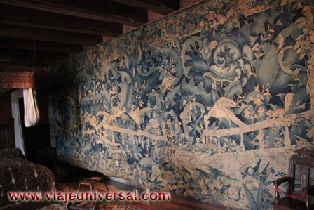 La siguiente estancia que visitamos “Salón de las mil flores”, destaca porque esta revestida de tapicería que en esa época formaban parte del mobiliario de la Edad Media. Aislaban de la piedra fría del castuillo, reducían las corrientes de aire y decoraban las habitaciones.
