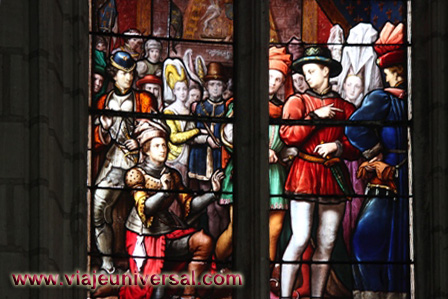 Detrás de Carlos VIII esta su hermana mayor Ana de Beaujeau que fue la regente durante la niñez del rey. Se le ve acompañado de Pedro de Beaujeau, uno de los príncipes más influyentes de su época.