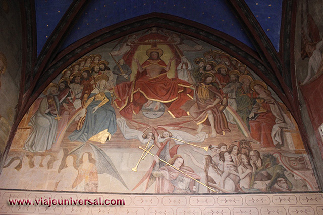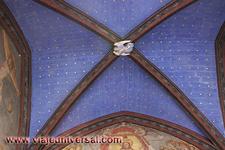 Las paredes de la sala están adornadas con revestimientos de madera que se pintaron en el siglo XIX. Encima ventanajes góticos con pliegues.