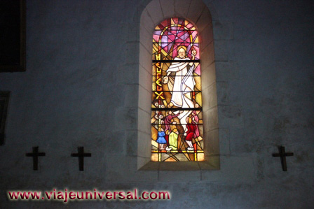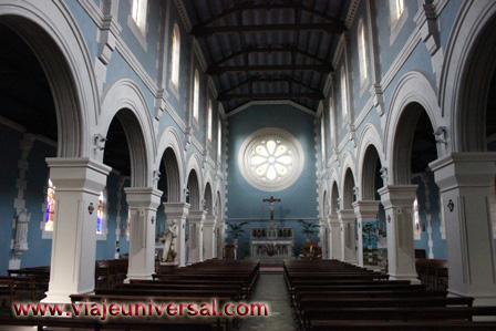 El interior, la planta tiene una nave central con dos colaterales de seis tramos cada una. Tiene forma de un casco del barco volcado con el marco expuesto. La pared axial de la cabecera está perforada con una rosa primitiva similar al arte románico italiano.