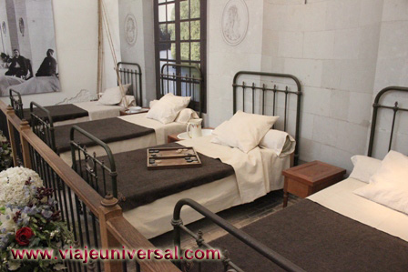 Las mesas tienen pies fijos, aunque en aquella época no existían, se montaban unos tableros móviles sobre unos caballetes y una vez que se terminaba de comer se desmontaban. Al ser una reproducción, las sillas se copiaron