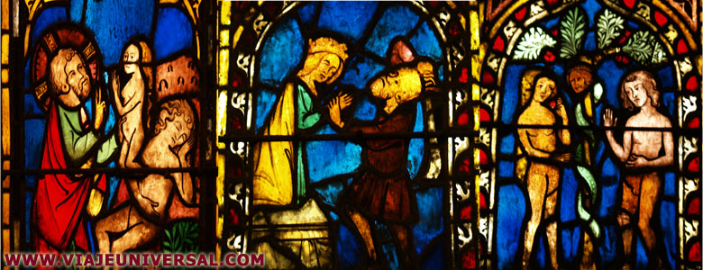 El vitral numero 1 esta situado al principio de la galería izquierda, tiene el titulo genérico “La venida de Cristo”. En él se representa: La creación de la mujer, Adán y Eva en el paraíso. La anunciación y el nacimiento de la Virgen, el nacimiento de María.