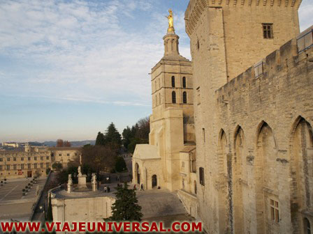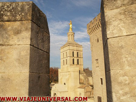 Saliendo a la Plaza del Palacio se encuentra la Catedral de Aviñón dedicada a la veneración de Notre-Dame-des-Doms. Fue construida en el siglo XV y posteriormente en el siglo XVIII fue reformada debido a los daños producidos durante la Revolución Francesa. Destaca por la sólida torre que se halla rematada con la figura de la Virgen dorada que data de 1859.