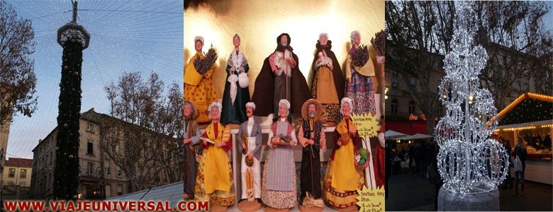 La plaza esta muy animada al atardecer cuando comienzan las luces de la noche que iluminan el mercadillo de Navidad de Avignon. Como capital de la Provenza tiene sus propias tradiciones diferentes a las alsacianas, aquí se celebra el Noël desde el 26 de noviembre hasta el 1 de enero de 2012, en horario de 9,30 a 19,00 horas. Nada tiene que ver con algunos de los mercadillos que hemos visto. Sobre sesenta artesanos y comerciantes se establecen en el corazón de la ciudad en casas de madera donde ofrecen productos de artesanía provenzales, estatuillas, textiles, cerámicas, etc. amenizados con danzas y cantos populares de la región