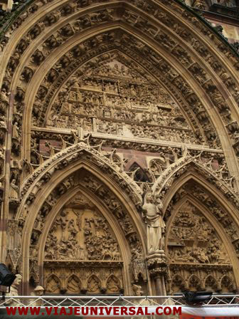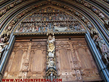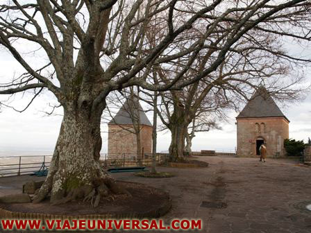 Bajamos y vemos la Portada y Logia de la Grande Chapelle, poco queda de la ornamentación que estuvo decorado con grandes personajes. Solamente queda uno, sin cabeza, situado en la parte central, se identifica con San Pedro, al que se dedica la veneración de la Gran Capilla. El dintel se corona con una doble puerta que representa el Juicio Final, de las demás ornamentaciones solamente quedan las figuras que representan a unos malvados que lanzan llamas del infierno. En los rodapiés de las jambas se conservan mejor.