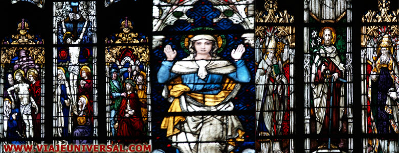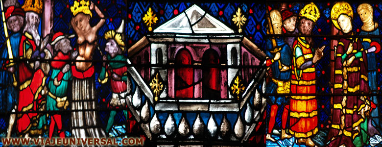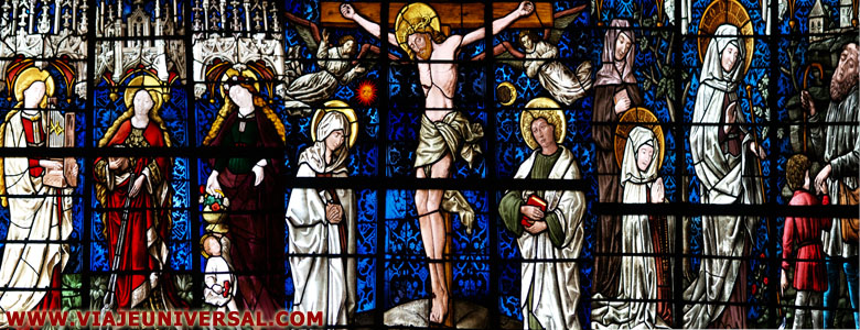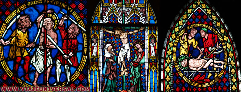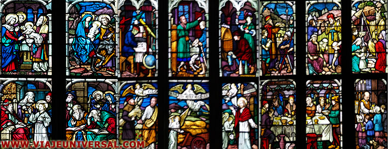 Los vitrales 1, 2 y 3 corresponden con la descripción de la venida de Cristo. Los vitrales 4 y 5 están dedicados al ciclo de la Pasión de Cristo. Los vitrales números 6 y 7 están dedicados a representar el ciclo del Triunfo de Cristo. Los vitrales numerados 8, 9 y 10 se representan las obras necesarias para las misericordias, además de puntualizar las diferencias entre las virtudes y los vicios.