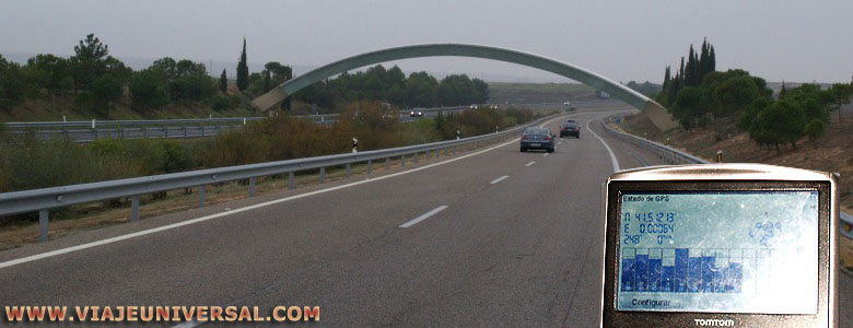 Antes de llegar a Zaragoza hay una curiosa referencia sobre la autopista de peaje y es el puente que designa el punto geográfico en que coincide con el meridiano de Greenwich, se encuentra situado en el kilómetro 82 de la AP-2 y indica las coordenadas N41.51213 // E 0.00000; aprovechamos para tomar unas fotografías de esta reseña del viaje.