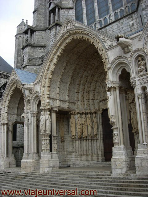 La fachada principal es la consecuencia de numerosos incendios y destrucciones, El frontispicio se divide en varios portales: El pórtico, llamado Pórtico Real se construyó para la anterior catedral románica y tiene forma de embudo. Esta decorado por altas figuras de reyes y personajes del Antiguo Testamento. Los frisos están decorados con escenas de la vida de la Virgen con San Joaquín y Santa Ana enfrentándose a la infertilidad. El tímpano está decorado con una escena del Juicio Final con Cristo triunfante rodeado por los símbolos de los evangelistas. La actitud de Cristo se encuentra alzando su mano derecha y sujetando Libro de la Vida. Sobre las arquivoltas se representan los ángeles y a los veinticuatro patriarcas del Apocalipsis; el pórtico izquierdo, está dedicado a la ascensión de Cristo, se representa a Cristo en una nube sostenido por dos ángeles, en las dos arquivoltas muestran los símbolos del zodiaco y labores relativas a los doce meses del año; el pórtico derecho, se representa la pureza de la Virgen María y su alegría como madre de Cristo, sobre el friso superior la figuras muestran la Presentación en el Templo, con la Virgen, Simeón. Sobre las dos arquivoltas se representan los ángeles, en la interior, y las siete artes liberales, en la exterior.