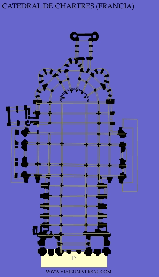 Las medidas de la catedral confieren la trascendencia de la arquitectura religiosa y la verdadera magnitud de la dificultad que supuso en la época la construcción de la Catedral de Chartres, con 130 metros de largo y desde 32 a 46 metros de ancho. La superficie construida es de 10.875 metros cuadrados; la altura de la torre sudoeste es de 105 metros; la altura de la Torre noroeste es de 113 metros.