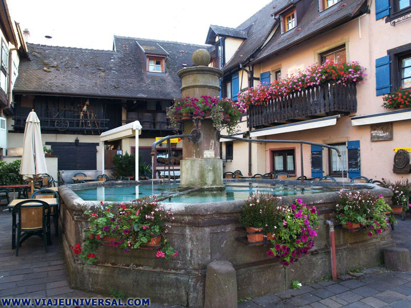 A lo largo de la calle principal de Eguisheim se encuentras algunas fuentes ornamentadas con flores de primavera, es una de las manifestaciones del desarrollo económico que alcanzo esta parte de Francia desde la Edad Media. El agua es uno de los bienes que más se desarrollo para ponerlo al alcance de las poblaciones alsacianas, de forma acta para el consumo y cercana a los domicilios. |