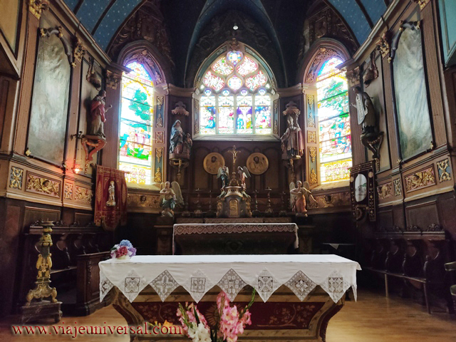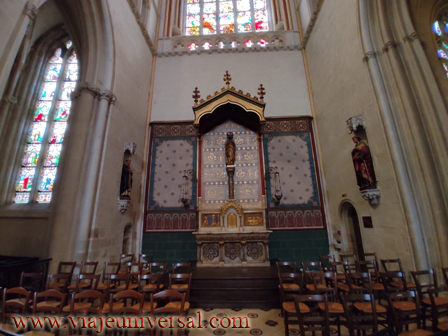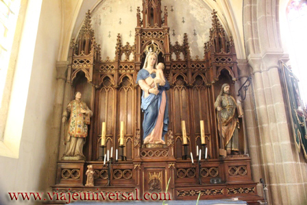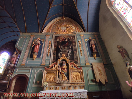 La iglesia tiene una disposición especial porque la cabecera no describe la cruz, es oscura, pero está iluminada por vitrales especiales. En el interior se venera la cabeza de un santo que era de la corte del rey de Francia y hacía grandes aportaciones para el pueblo.