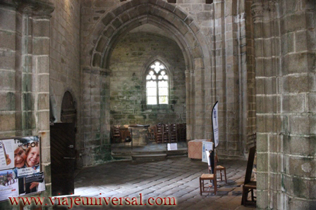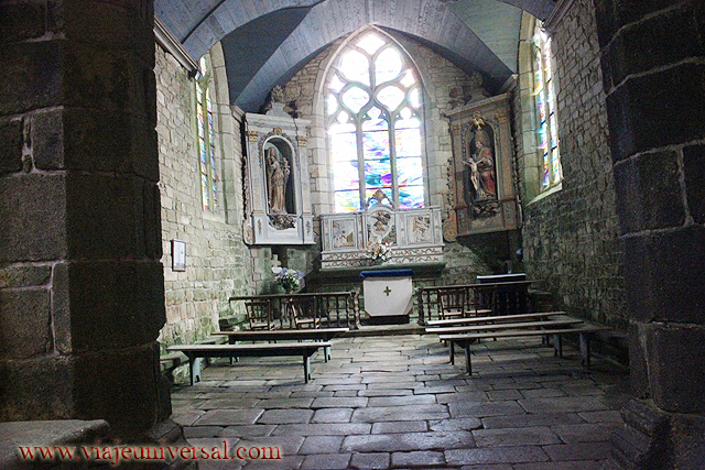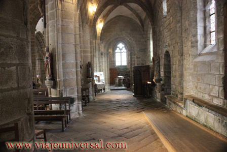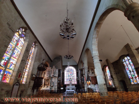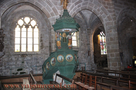 El interior de la iglesia consta de la planta con nave central dividida en cinco tramos y dos naves colaterales, el crucero y un coro profundo, de dos tramos con laterales y ábside plano. En la ventana principal se encuentran los escudos de armas de las familias Rosmadec, Tivarlen, Lespervez, Pont-Croix, Thomelin, Molac, La Chapelle y Quélénnec.