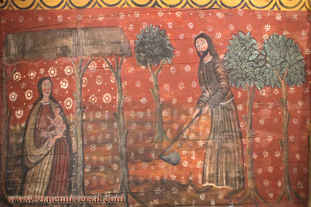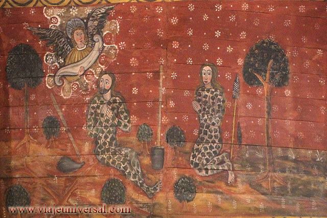 La escena representa Adán y Eva rebajando, están vestidos con ropas de su tiempo, llevan herramientas de trabajo y construyen los cimientos de madera de su futura casa, en las esquinas se representan los árboles del Edén.