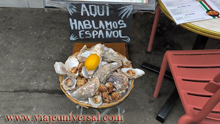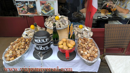 Hacemos una compra de productos franceses en el Auchan, compramos calamares frescos a 9 euros, mejillones franceses son pequeños pero muy buenos de sabor, muslos de canard, pan, vino, yogures, etc.