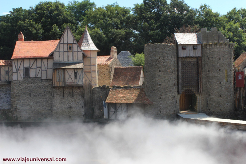 “Les Chevaliers de la Tabla Ronde ”. El escenario es la puerta principal de la antigua ciudad medieval de Puy du Fou, donde se recrea la historia de la Leyenda del Rey Arturo, la obra es corta porque solamente dura unos 15 minutos.