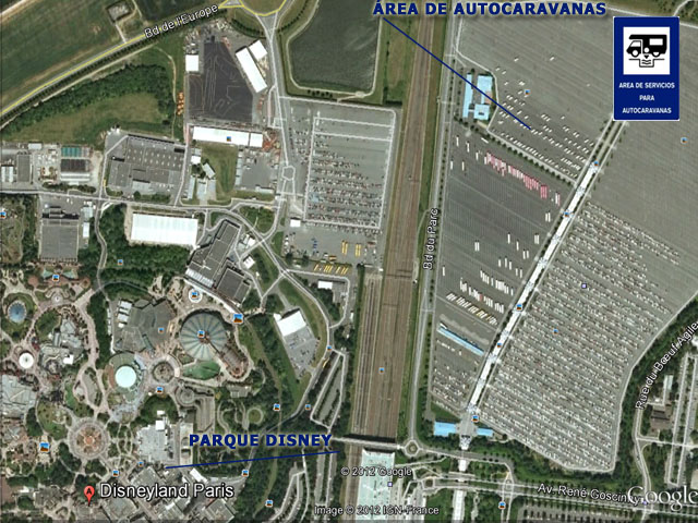 El área de autocaravanas de Disney París se paga al llegar a la taquilla y previo pago de 20 euros; las coordenadas GPS corresponden con N 48.87657 // E 2.78544 .