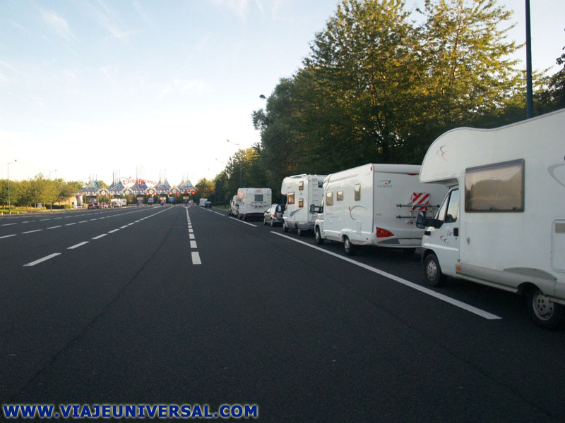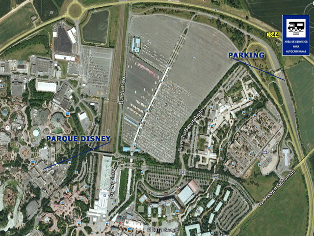 El parking de autocaravanas esta situado en el lateral de la entrada al parque de Disney en París. Las coordenadas GPS corresponde con: N 48.87596 // E 2.70697.