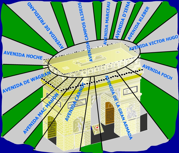 Desde la gran azotea nos permite identificar los principales monumentos de París: El eje de la avenida de los Campos Elisios y la avenida de la Gran Armada. El otro eje principal formado por la avenida de Cléber y la avenida de Wagram. El Eje secundario de la avenida Victor Hugo- avenida Hoche, eje Rue Mac Mahon- avenida D'lena, eje avenida Foch- avenida Friedland.