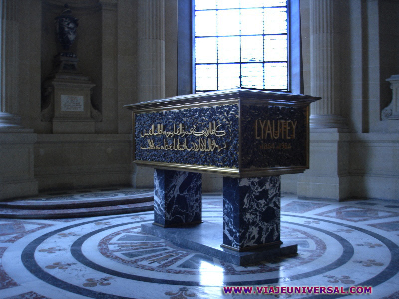 La tumba Mariscal Lyautey nació en1854 y murió en 1934, fue primer Comisario General de Francia en Marruecos en 1912, elegido por la Academia francesa en 1912 (Lyautey muchas obras), Ministro de Guerra entre diciembre de 1916 a marzo de 1917, fue nombrado Mariscal de Francia en 1921, se encargó de organizar la Exposición Colonial de 1931, se murió el 27 de julio de 1934, se enterró en Marruecos, su cuerpo se llevó a los Inválidos en 1961.