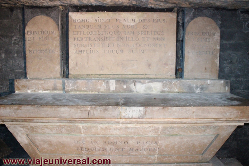Seguimos el camino y llegamos a la Cripta de Sacellum, aquí la galería se amplia alrededor de un altar que imita a una antigua tumba. A la izquierda hay una placa que recuerda las primeras osamentas trasladadas del cementerio de los Inocentes en abril de 1786.