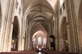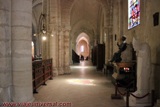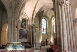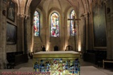 Un arco triunfal apoyado en las columnas romanas da la entrada al ábside, este, esta iluminado por los vitrales de Max Ingrand realizo para la rehabilitación de la iglesia en 1953 y que tanta controversia han generado al no coincidir con la iluminación de ábside de estilo románico.