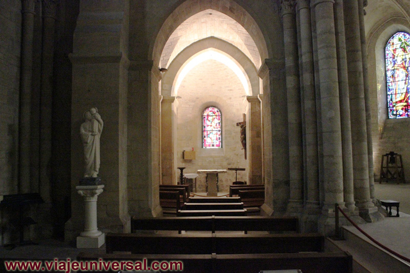 Un arco triunfal apoyado en las columnas romanas da la entrada al ábside, este, esta iluminado por los vitrales de Max Ingrand realizo para la rehabilitación de la iglesia en 1953 y que tanta controversia han generado al no coincidir con la iluminación de ábside de estilo románico.