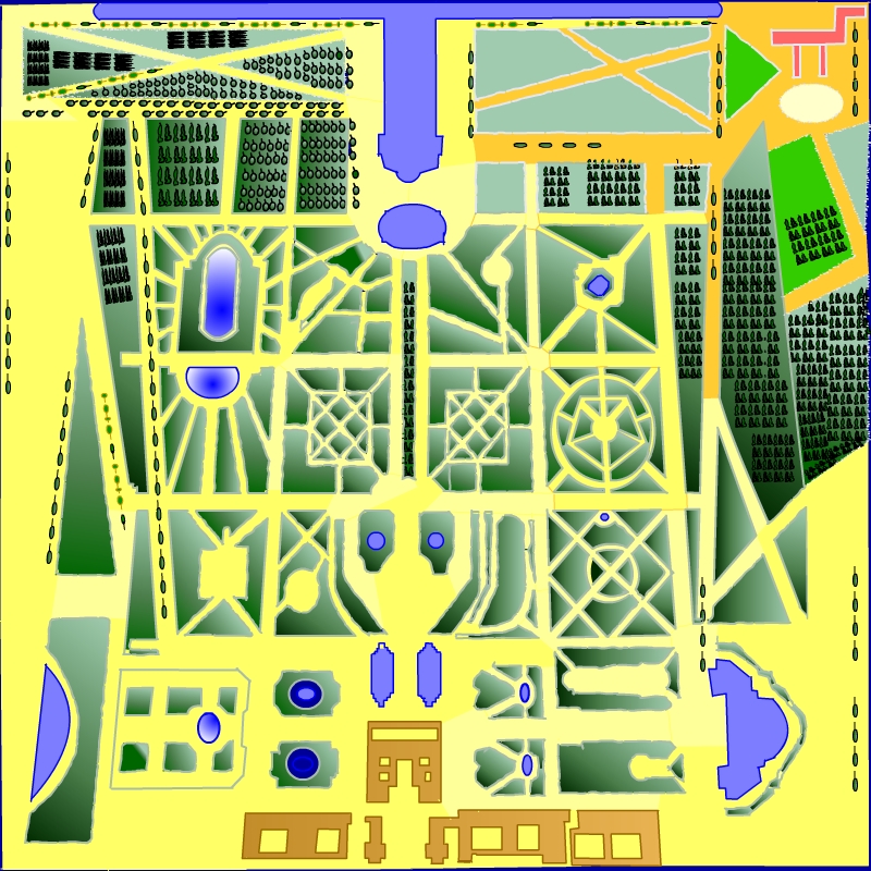 Uno de los mayores atractivos que tiene Versalles son sus jardines: Destacan los parterres, las fuentes, las amplias avenidas con árboles y pequeños bosques llenos de estatuas. Su diseño fue del llamado Roi Soleil. Todo estaba en contra de su construcción, la tierra no era buena, no había agua, pero todo ello no desanimo al monarca, mando remover el suelo y trajo el agua desde lejos, mando elevar el lago Clagny con unas máquinas ingeniosas, que estaba en un lugar muy inferior. Las bombas diseñadas elevaban el caudal del lago a razón de 2.500 metros cúbicos por día.