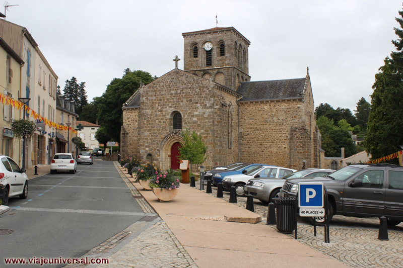 La iglesia esta rematada con la bandera francesa en memoria del prefecto de 1793, que ordeno retirar la cruz y sustituirla por la bandera tricolor, del exterior destaca los canecillos que soportan los aleros donde se representan cabezas humanas o de animales. El templo fue construido en sillería de granito, tiene exteriormente un aspecto defensivo porque estaba dentro de una zona de conflictos. La portada principal fue construida con nueve arquivoltas con arcos ligeramente apuntados sin capiteles y decoraciones, salvo un modillón en la clave del arco principal que pudiera representar al maestro de obra. Las naves laterales tienen amplios ventanales con arcos nervados góticos cubiertos con grandes vitrales.