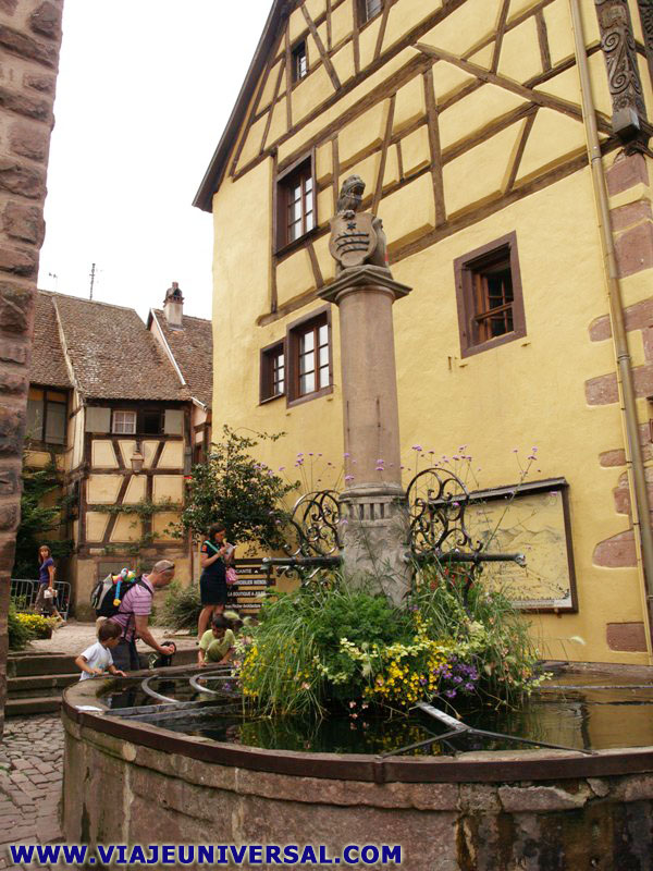 Fontaine de la Sinne , fue construida en 1560 se utilizaba para el lavado de los grandes barricas y otros recipientes de vino. Esta coronada por un León con el blasón heráldico perteneciente a los señores de Horbourg y el escudo de armas de Riquewihr. |