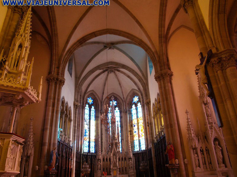 El interior esta formado por una planta dividida en tres naves, ofrece el diseño típico de las iglesias francesas de la época, muy estilizadas con una columnas tan altas que parecen alcanzar el cielo.