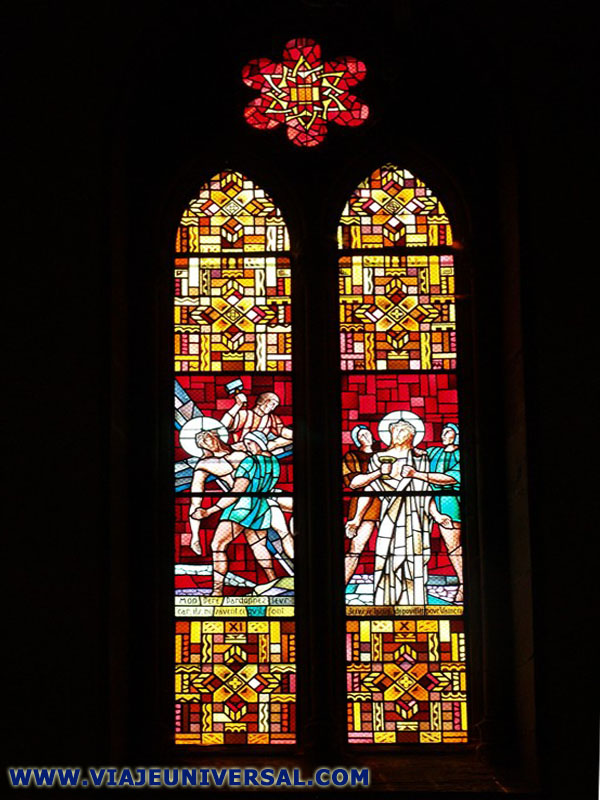 El altar mayor realizado en piedra forma un impresionante conjunto adornado con la luminosidad del color que llega desde los vitrales de la cabecera.