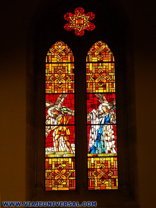 El altar mayor realizado en piedra forma un impresionante conjunto adornado con la luminosidad del color que llega desde los vitrales de la cabecera.